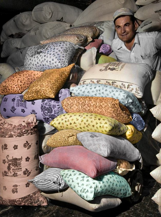Мешки с мукой. США, 1930-е. Во время Великой депрессии производители муки узнали, что бедствующие матери часто шьют своим детям одежду из мешков из-под муки, поэтому они стали производить такие мешки из цветных фабричных тканей.