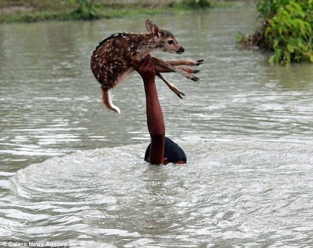 4. Героический мальчик рискует своей жизнью, чтобы спасти олененка, который тонет в паводковых водах Бангладеш