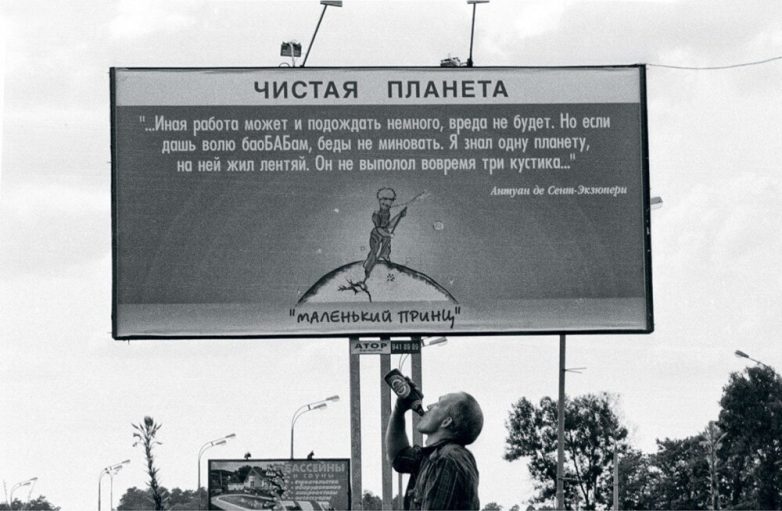 Мужчина выпивает пиво Балтика на фоне рекламного баннера с цитатой из «Маленького принца», с намёком на (БАБ) Борис Абрамович Березовский. Москва