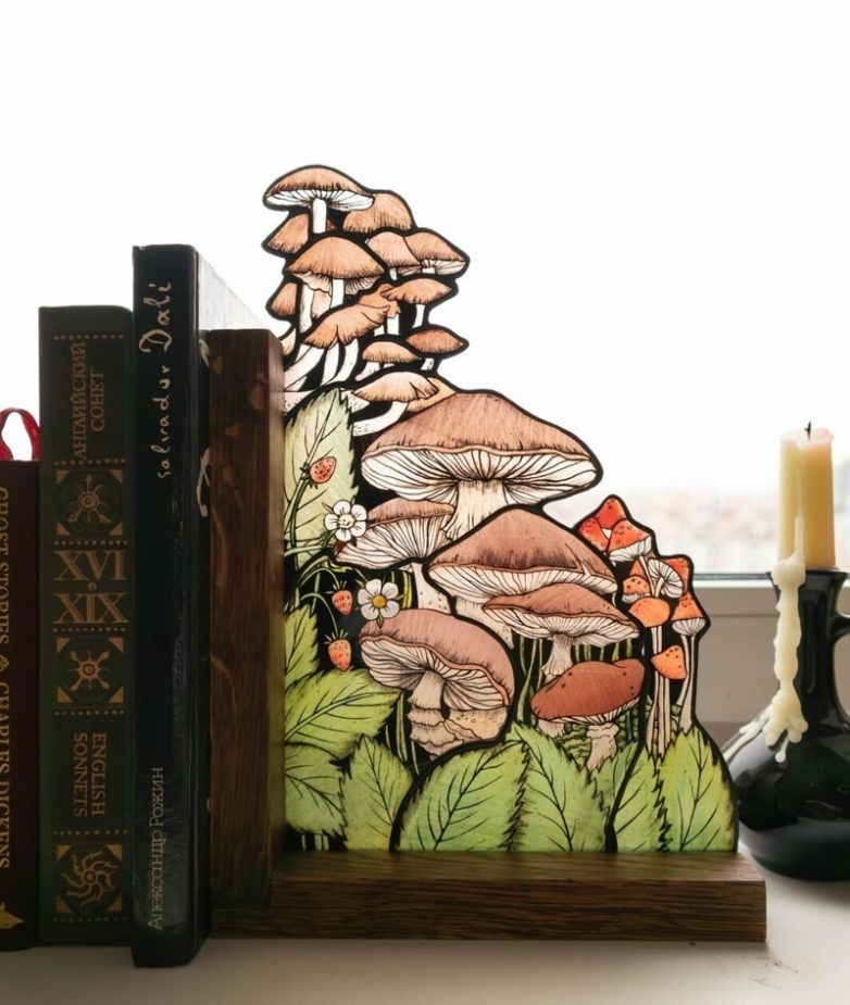 10. Подставка для книг с грибами из цветного стекла ручной работы