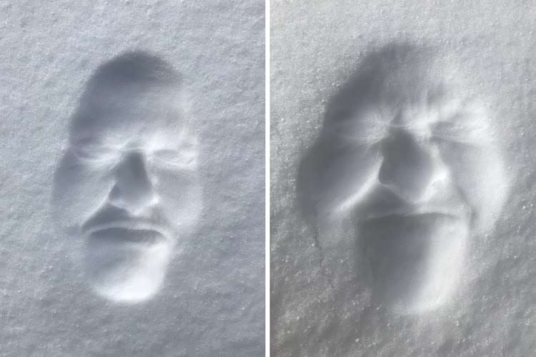 Автор фото впечатывал своё лицо в сугробы, но его вогнутый отпечаток создаёт впечатление выпуклого изображения. Довольно забавный эффект.