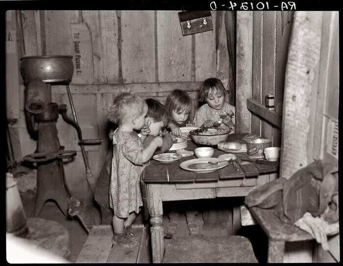 Рождественский ужин в доме Эрла Поли недалеко от Смитфилда, штат Айова. Ужин состоял из картофеля, капусты и пирога, 1936 год
