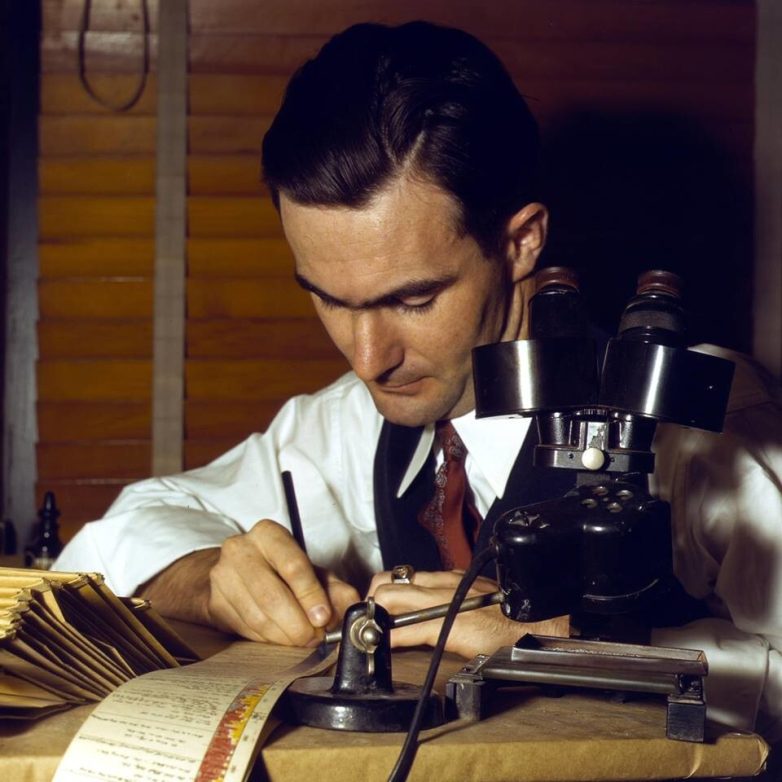 Геолог изучает шлам из скважины, Амарилло, Техас, 1943