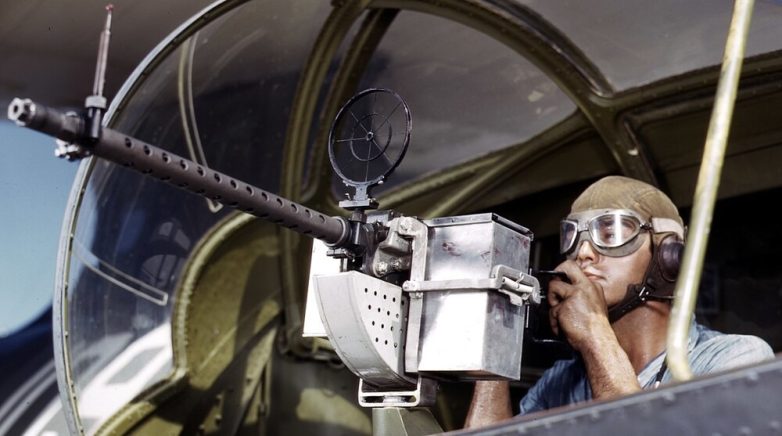 Джесси Роудс Уоллер испытывает пулемёт 30-го калибра, который он только что установил на боевой самолёт ВМС США на базе, Корпус-Кристи, Техас, август 1942