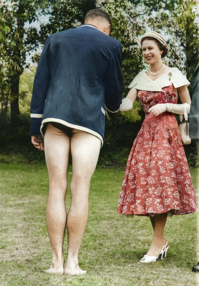 Королева Елизавета II во время посещения школы Mill Hill School приветствует капитана сборной по плаванию Д.Г. Оуэна, 1957 год.
