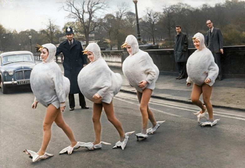 Полицейский останавливает движение, чтобы пропустить четырех «цыпочек» через мост Серпентайн в Гайд-парке, Лондон, 10 марта 1966 года.