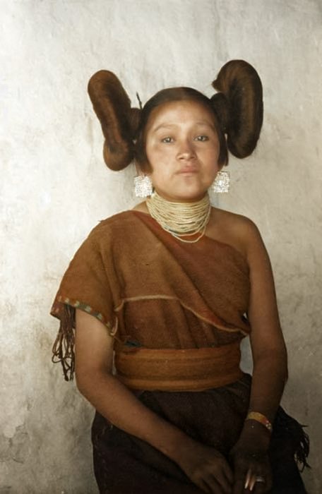 Женщина из индейского племени хопи, 1890 год.Традиционная прическа в виде «завитка цветка тыквы» была популярна среди незамужних девушек племени хопи. Этот стиль символизировал их статус и молодость, а также отражал культурные традиции этого народа.
