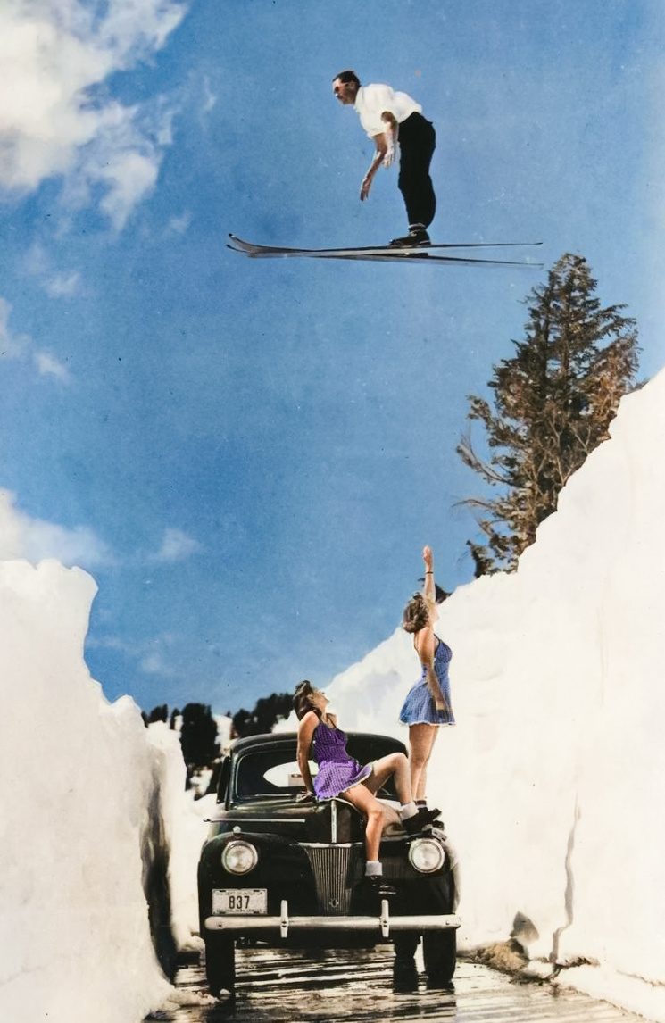 Лыжник Дик Браун перепрыгивает через свой автомобиль. Округ Лассен, Калифорния, 1940 год.
