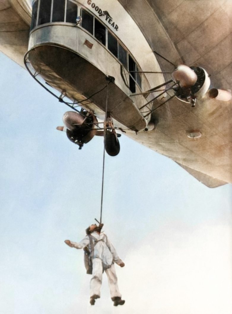 Знаменитый американский акробат, прикрепленный к летящему дирижаблю на веревке на высоте 1000 метров.