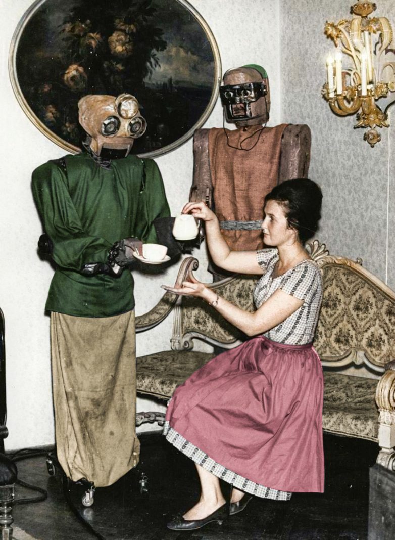Роботы, названные психотронами их австрийским изобретателем Клаусом Шольцем, один из них протягивает чашку чая фрау Шульц, около 1950 года в Вене.