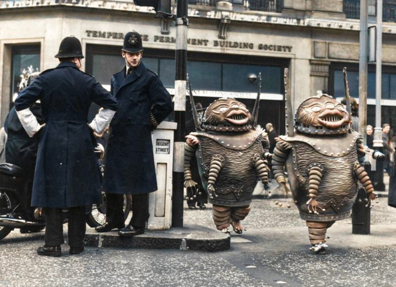 Полицейские с тревогой наблюдают, как пара инопланетян небрежно идет по Риджент-стрит. Лондон, 1964 год.