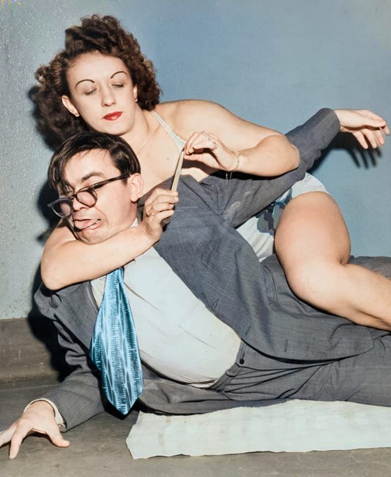 Рестлер Милдред Берк подпиливает ногти, сдерживая журналиста, 1947 год.