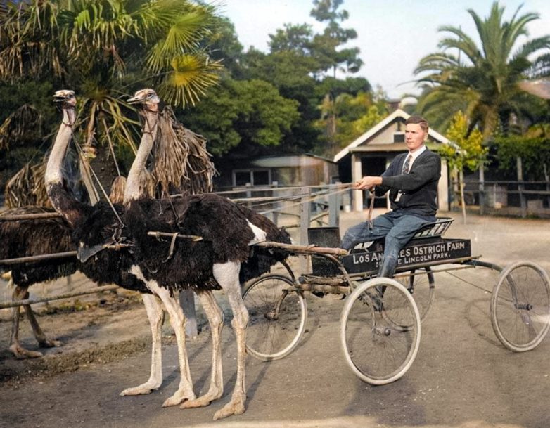 Некоторые предприниматели, разочарованные высокой стоимостью содержания птиц (один страус стоил до $1000 в 1910-х, что эквивалентно ~$30 000 сегодня), начали искать дополнительные способы монетизации. Возникла идея использовать страусов не только для перьев, но и в качестве транспортного средства, подражая традициям использования лошадей и верблюдов.