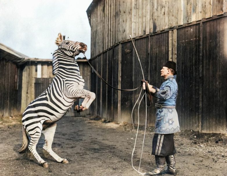 Артист цирка обучает зебру стоять на задних лапах, 1920 год.