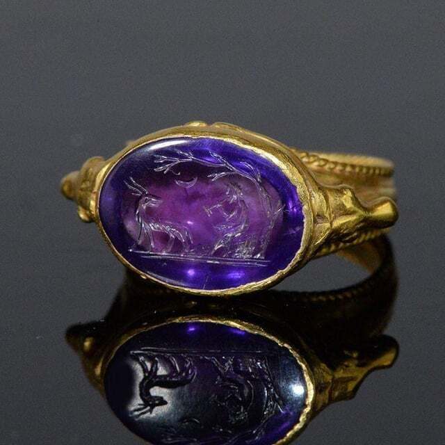 Древнеримское золотое кольцо с аметистовым выгравированным изображением Пана (бога дикой природы), играющего на свирели