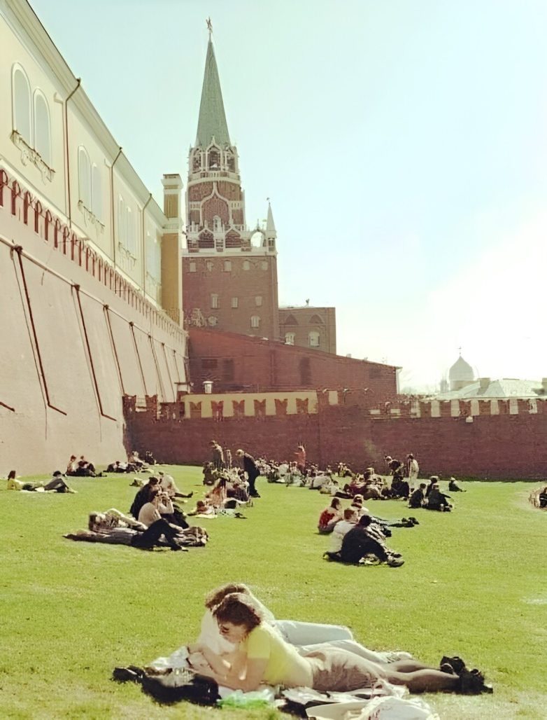 Moсквичи отдыхают на газоне у Кремлёвской стены. Москва, 1999 год