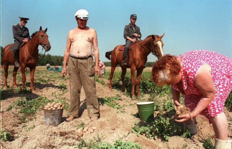 Конная милиция патрулирует картофельное поле возле города Нарофоминска, а местные жители собирают картошку. 28 августа, 1995 год.