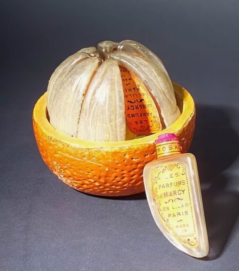 Флакон для духов из восьми стеклянных флаконов, оформленных в виде сегментов апельсина. Они размещены в специальной керамической подставке, украшенной росписью, 1925-й