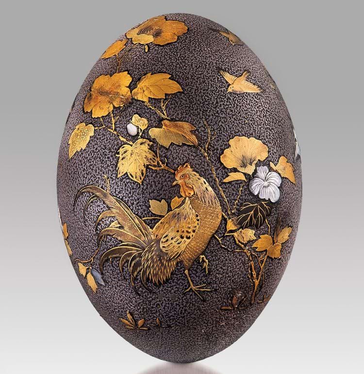 Яйцо эму, украшенное петухом и цветами. Япония, период Мэйдзи, 1890-1900 гг.