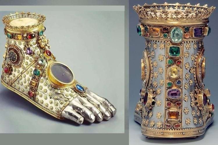 Реликварий для ног из сокровищницы Базельского собора, 1450 г., серебро, медь, позолота, перламутр, эмаль, жемчуг, драгоценные камни и стекло