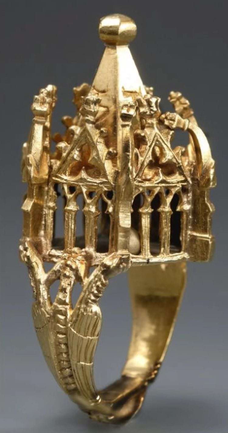 Еврейское обручальное кольцо, Германия, первая половина XIV века. Кольцо имеет форму миниатюрного здания, символизирующего утраченный Иерусалимский храм, и имеет полосу в виде сцепленных рук обрученной пары