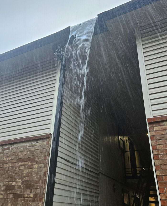 «Водопад над входом в мою квартиру, когда идет дождь. Нет, желоба не забиты. Так задумано»