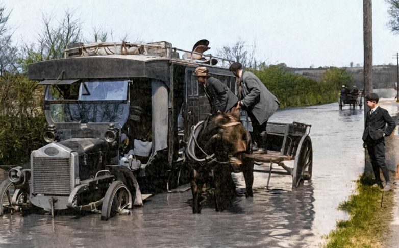 Разлив реки Стаур в Нейленде, графство Саффолк, и спасение застрявшего автобуса лошадью и повозкой, 1919 год.