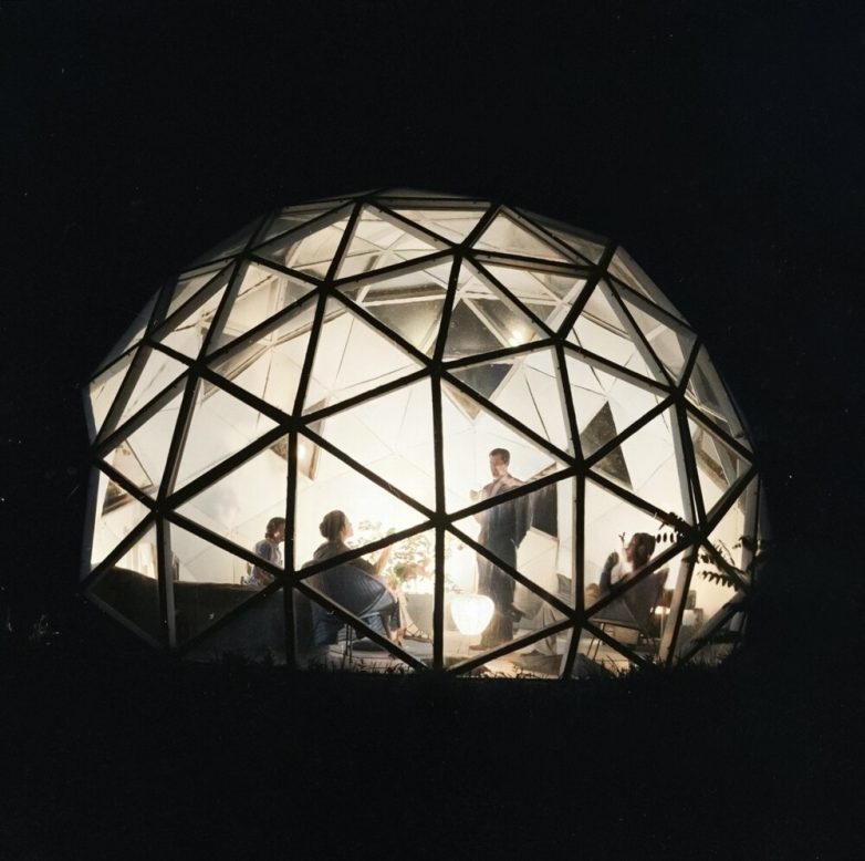 Здание, спроектированное Хью, представляет собой купол из мозаичных стеклянных треугольников.