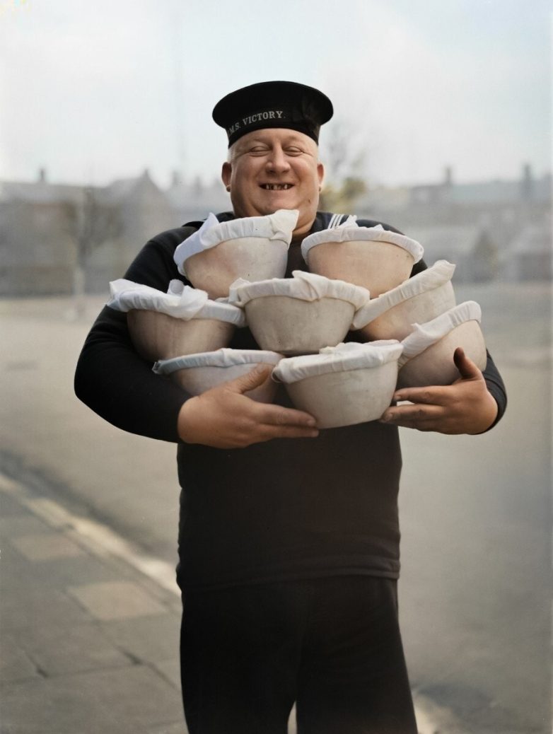 Матрос с британского линкора HMS Victory держит в руках девять мисок с пудингом, накрытых чистой тканью. Это была радость на тарелке, маленькое праздничное чудо посреди суровой жизни на корабле.