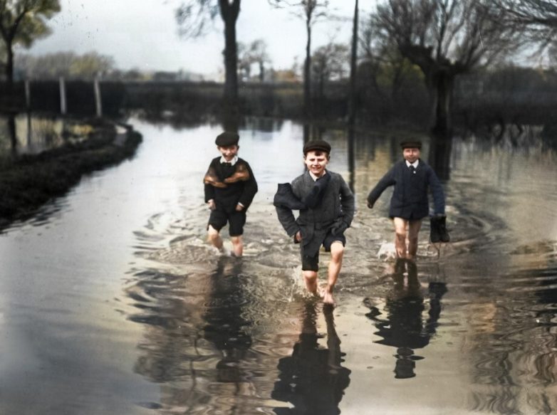 Трое детей переходят залитую дождем улицу по пути в школу в Эгхэме, Англия, 1913 год.