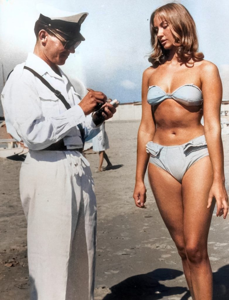Полицейский выписывает штраф за ношение бикини на пляже в Римини, Италия, 1957 год.