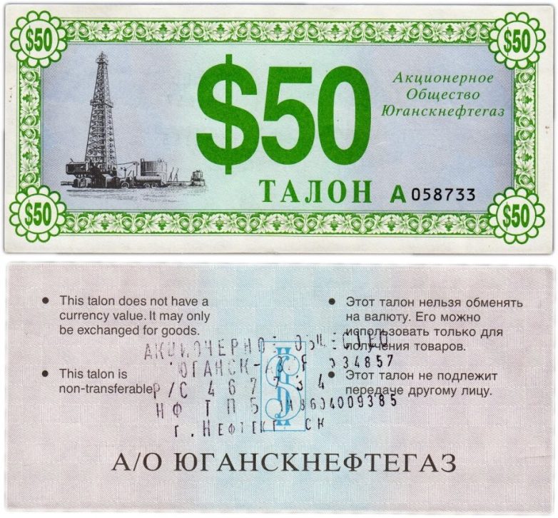 Талон — ваучер. Их выдавали работникам Юганскнефтегаза. (номиналы были разные и их мог купить/продать на городском рынке любой желающий)
