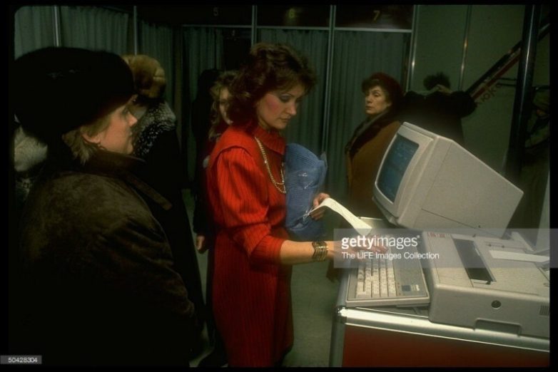 Продавщица магазина «Люкс» оформляет покупку с помощью персонального компьютера, 1989 год, Москва