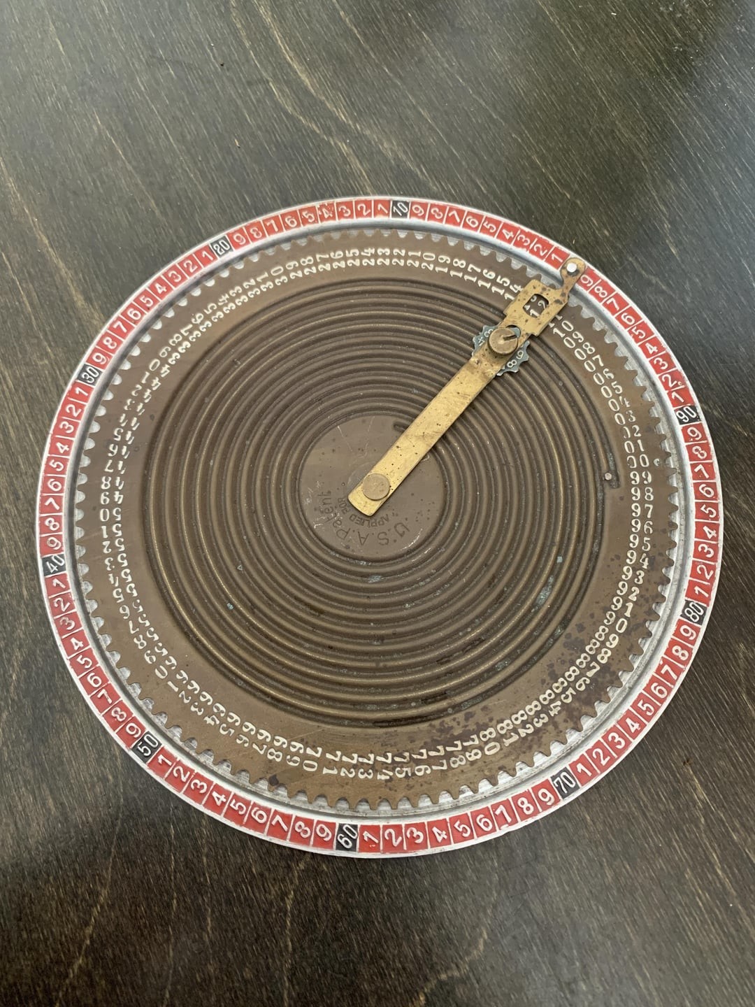 10. Плоский алюминиевый диск с медным вращающимся циферблатом и спиральной канавкой на нём
