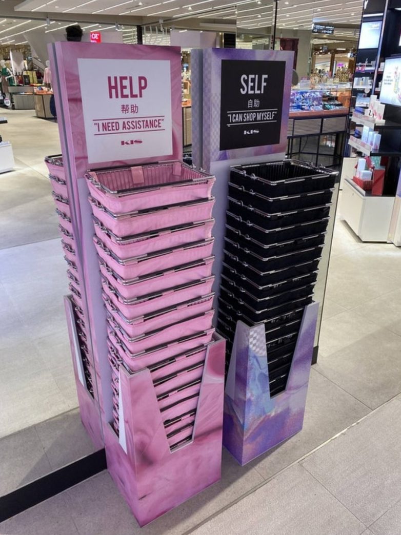 Разноцветные корзины, как индикатор — кому нужна помощь сотрудников магазина, а кто любит шопинг самостоятельно