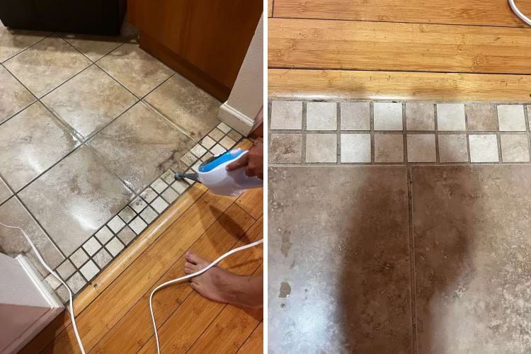 Нижняя правая фотография показывает плитку после того, как автор фото почистил её своими силами. Автор фото написал, что принял душ примерно за 5 часов до того, как его ноги стали чёрными.