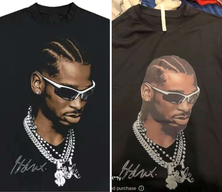 Футболка слева могла бы быть такой, если бы была изготовлена с помощью печати на футболке (а не с помощью Фотошопа), а правое изображение, по всей видимости, уже наносили на ткань с помощью термотрансферной печати. Выглядит довольно паршиво