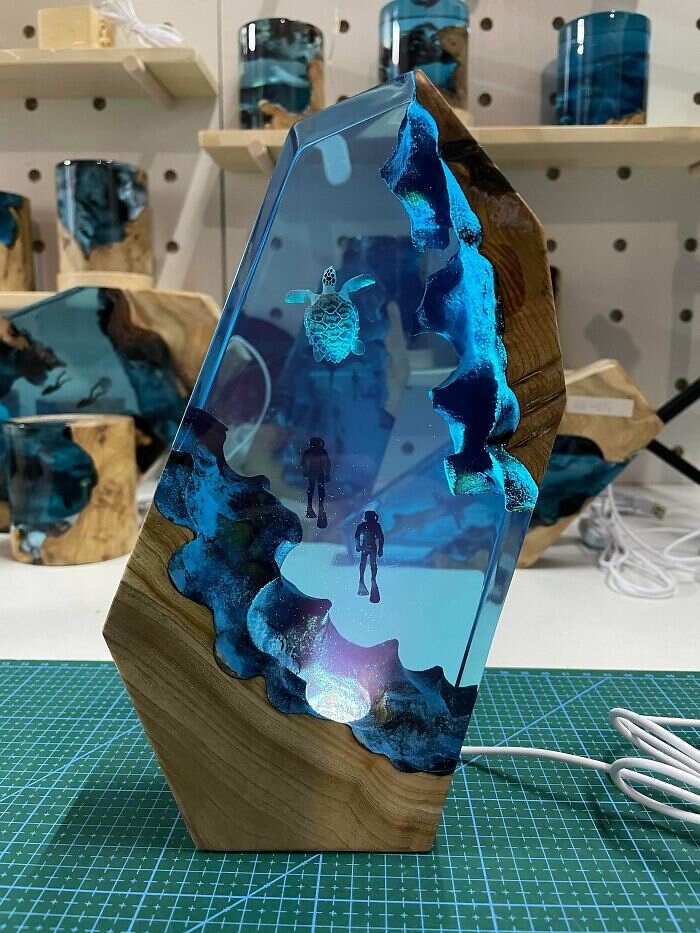 12. Деревянный стол со светом, просачивающимся через щели эпоксидной смолы