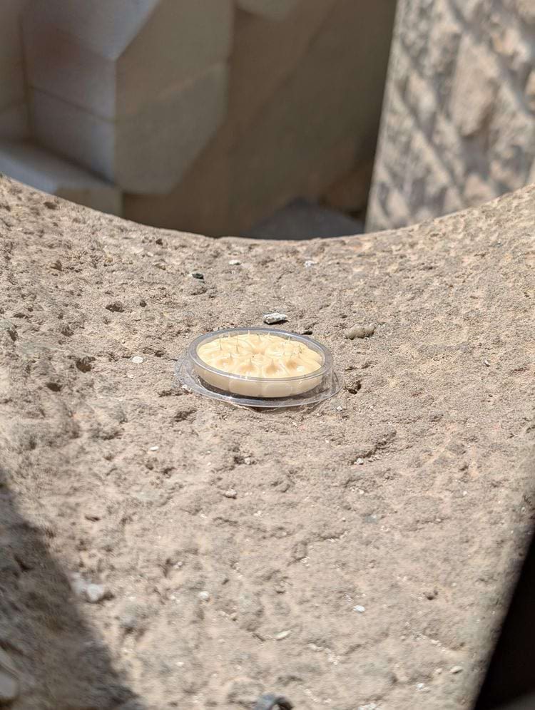 16. Вопрос: «Странная чашка Петри, наполненная «майонезом» на подоконнике башни Саграда Фамилия, Барселона. Нашла эту штуку на подоконнике (если это можно так назвать) башни на фасаде Страстей, спускаясь по лестнице. В каждом окне была одна из этих штук»