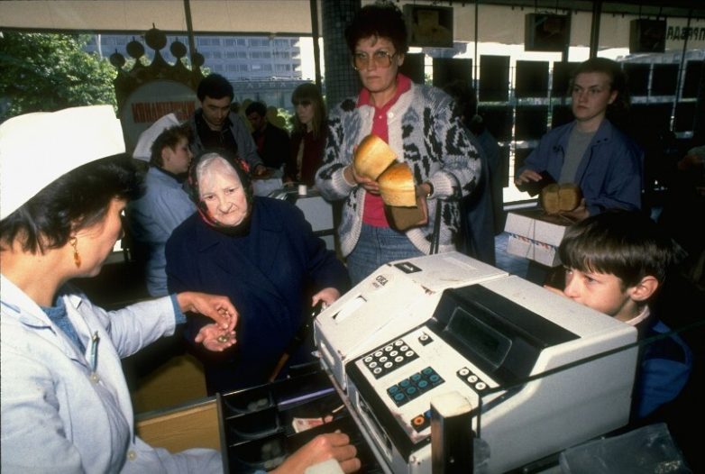 На кассе в магазине «Хлеб» на проспекте Калинина, 1990 год, Москва