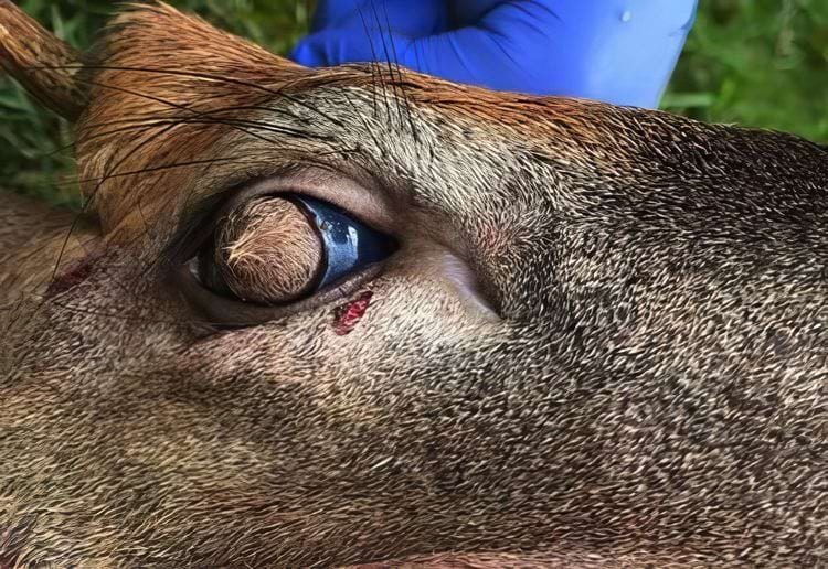Олень с генетической болезнью, из-за которой у него растут волосы на глазных яблоках