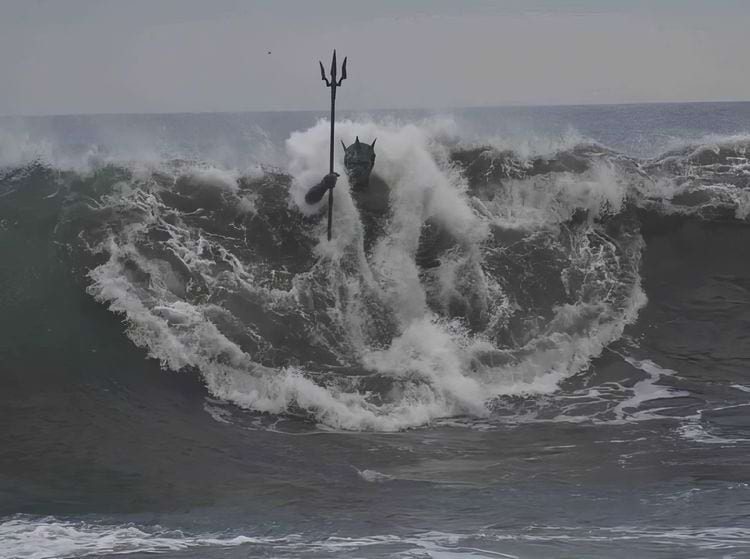 Нептун, поднимающийся из моря — статуя, которая исчезает и появляется вместе с волнами. Пляж Меленара на Гран-Канарии, Испания