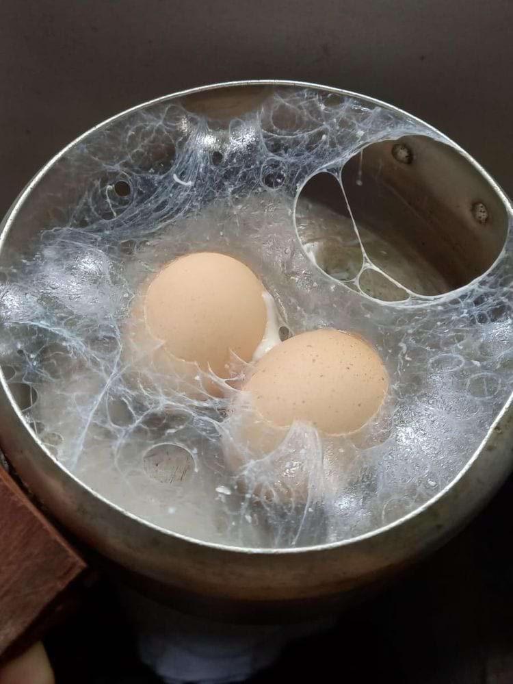 Белковая паутина! Яйцо треснуло во время варки, а образовавшаяся пена подняла вытекший белок из яйца в верхнюю часть кастрюли