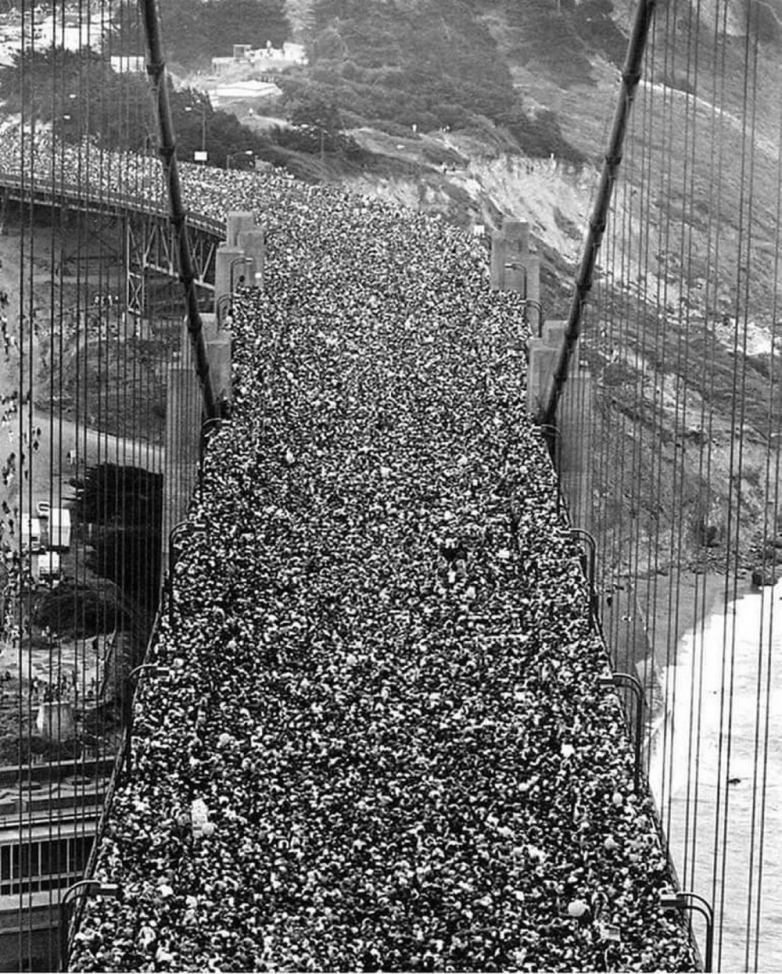 Висячий мост через пролив Золотые Ворота в Калифорнии, США. Соединяет город Сан-Франциско на севере полуострова Сан-Франциско и южную часть округа Марин, рядом с пригородом Сосалито. В первый день 200 000 человек заплатили по 25 центов за возможность пройти по нему. 18 000 человек выстроились в очередь ещё до рассвета, а каждый час по самому длинному в мире подвесному мосту проходило 15 000 пешеходов.