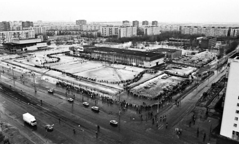 Извилистая очередь на «Ярмарку вакансий» на проспекте Просвещения, 1994 год, Санкт–Петербург