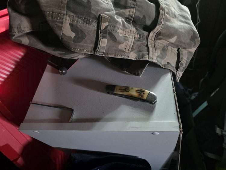 Нож не разложен, а его рукоятка отбрасывает тень, создавая иллюзию лезвия