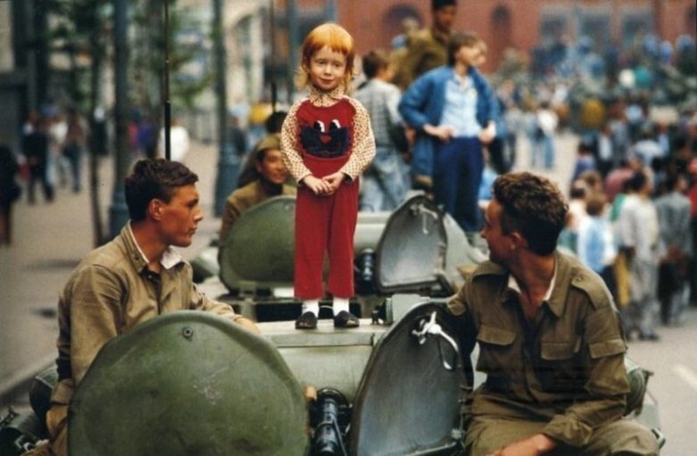 Ребёнок общается с солдатами, стоя на башне БМП. Москва. СССР. Август 1991 г