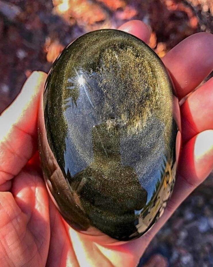 Завораживающий момент демонстрирует редкую разновидность вулканического стекла — золотистый обсидиан из Мексики. Камень словно содержит в своих глубинах жидкое солнце, переливающееся при малейшем повороте.