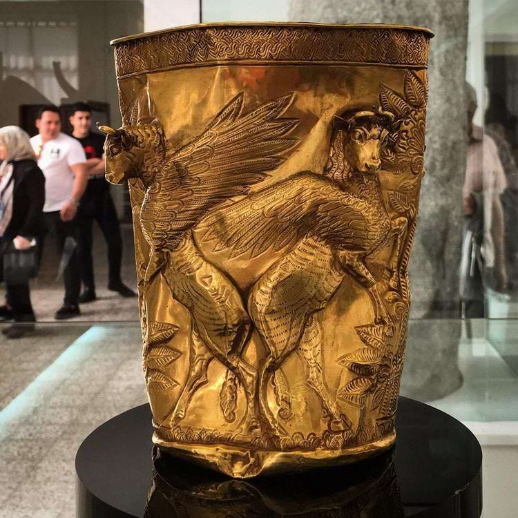 16. Кубок Марлик, датируемый примерно 1400 годом до н. э., изображает четырёх мифических крылатых быков в реалистичных и динамичных позах с расправленными крыльями, словно готовых взлететь. Обнаруженный в деревне Марлик на севере Ирана, он хранится в Национальном музее Ирана