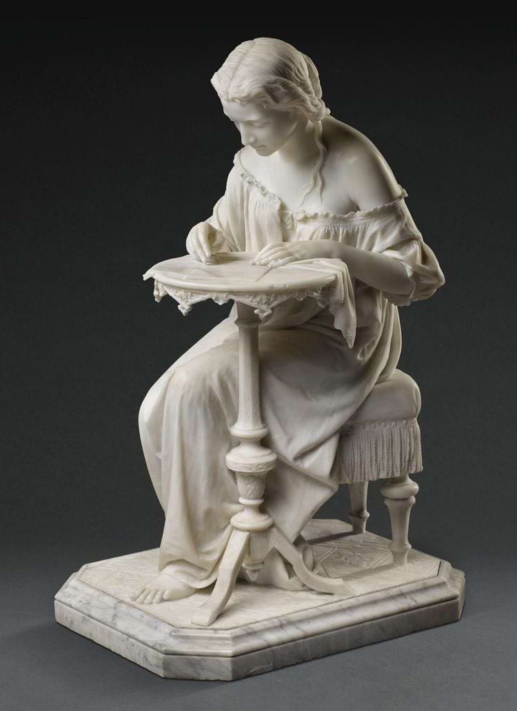 10. Джованни Спертини, Fanciulla Che Scrive (Девушка, пишущая), 1874 г., белый мрамор, на пёстрой серой мраморной основе